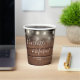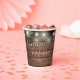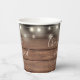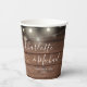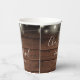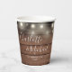 Taza de papel de boda rústica elegante personalizada con nombres de estilo de firma y la fecha de su boda especial en un fondo de luces de cuerda y paneles de madera. Diseñado por Thisisnotme