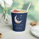 Beba con estilo con este elegante vaso de papel con tema celestial. Diseñado con un fondo azul marino profundo, una luna de acuarela dorada y estrellas brillantes, complementa maravillosamente su decoración de baby shower "Luna de Amor".
