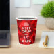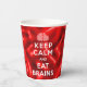 ¿Un apocalipsis zombi? Sin más. Basándose en el meme Keep Calm, la taza dice "Mantén la calma y come los cerebros". No hay corona, por supuesto, pero hay un cerebro — ¡falta un mordisco! y un fondo sangriento. Divertido para Halloween, o en cualquier momento te estás escondiendo de los no-muertos.