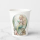 Copas de papel de sirena - Una hermosa y larga sirena de cabello limpio, flores rosa pálido en su cabello y en su cuerpo, su cola está hecha con balanzas verdes y doradas, brillando en el mar brillante. Ella está sentada en una roca, sosteniendo una gran hierba verde y blanca. ¿Qué hay dentro? Podría ser una perla, algo de oro o algún otro tesoro misterioso. En la parte de atrás está la escritura - Esta es mi copa - ¡con espacio para escribir el nombre del dueño en el fiesta!