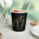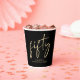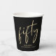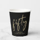 Decoración divertida de cumpleaños número 50 tazas de papel negro con "cincuenta" exhibidas en un guión de oro de moda.