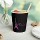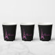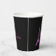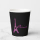 Glam Paris temática Dulce Dieciséis tazas de papel para fiestas de cumpleaños, con purpurina rosa mirando la Torre Eiffel sobre un fondo negro. El texto personalizado rosado dice París. Hay servilletas, platos e invitaciones que coinciden.