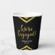 Estas tazas de papel modernas presentan un diseño elegante de chevron geométrico y las palabras "Estamos comprometidos" en lámina de oro falsa sobre un fondo negro; perfecto para una fiesta de compromiso.