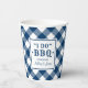 "Lo hago" tazas de fiesta de papel boda BBQ presentan un fondo rústico recubierto de manteles azul marino y gingham blanco con estampado con texto personalizado para los primeros nombres de la pareja novia y novio que pueden ser personalizados. Perfecto para un evento casual de boda de verano.