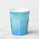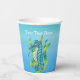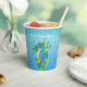 Estas tazas de papel son varios tonos de azul con una criatura mística del océano o caballito de mar que es azul acuático y blanco con su cola envuelta en algas verdes en la parte delantera y trasera. Personalizar el texto con las plantillas en la parte delantera y posterior.