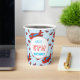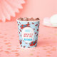 Un lindo patrón de avión rojo y azul con un color de fondo azul claro y un nombre personalizado en el medio. Diseño perfecto para niños o chicas que aman aviones, aviones, aviones o vuelos. Copas de papel ideales para la fiesta de cumpleaños de los niños. La decoración fiesta se puede ver en la colección de este diseño.