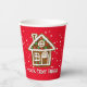 Navidades de papel tazas con adorable diseño de casa de jengibre. Diseño divertido de fiestas para niños y adultos. Añade tu propio saludo y nombre. Hágalos para amigos, familia, negocios, huéspedes, visitantes, niños, empleados y más. Galleta jengibre con nieve. Impresión a dos caras. Fondo de color rojo o personalizado.
