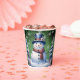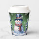 Disfrute de sus bebidas favoritas de vacaciones con un conjunto festivo de copas de papel de Navidades de invierno. El diseño de la copa de papel incluye un lindo muñeco de nieve con un bonito sombrero superior y una bufanda parados en una escena del bosque invernal con caída de nieve. También hay artículos de regalo y de vacaciones disponibles con este diseño.