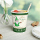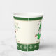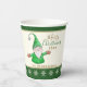 Cree vasos de papel únicos y personalizados para Navidades verdes para su fiesta familiar con un diseño lindo que incluye un dicho de Feliz Navidad, ilustracion gnome y plantillas de texto para el año y nombre de la familia.