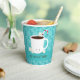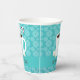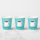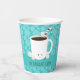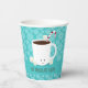 Cups de papel para un fiesta de chocolate caliente para Navidades. Estas tazas cuentan con una jarra sonriente de cacao caliente, con un bastón de caramelo y varios golosinas alegres, sobre un copo de nieve y fondo verde azulado azul. Todas las palabras se pueden personalizar. Navidades Fiesta Copo de nieve Papel de chocolate caliente Tazas de carne Dulce Arte de comida | ©Melissa Patton - Artista/Ilustrador