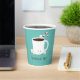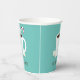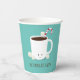 Cups de papel para un fiesta de chocolate caliente para Navidades. Estas tazas cuentan con una jarra sonriente de cacao caliente con un bastón de caramelo y varios golosinas alegres sobre un fondo verde azulado. Todas las palabras se pueden personalizar. Navidades Fiesta Verde azulado Chocolate caliente Cacao caliente Cubos de papel Dulce de comida | ©Melissa Patton - Artista/Ilustrador