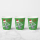 Estas tazas de papel son verdes con pequeñas motas de oro y un divertido esqueleto sosteniendo adornos cubiertos de copos de nieve rojos y verdes hasta los ojos con un sombrero de Santa roja con texto de Feliz Navidad en rojo en la parte delantera y trasera.