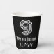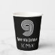 El diseño de la copa de papel temático inspirado en el estilo de los años 20-30 presenta un gran estilo Art Déco inspirado en el número "9", además del mensaje de bienvenida de cumpleaños "Feliz noveno cumpleaños" y un nombre personalizado. El fondo es negro de color. Las tazas de papel temáticas de cumpleaños como esta pueden ser divertidas de usar en un fiesta que está siendo retenido por alguien que está celebrando su noveno cumpleaños. [~Z0000542]