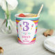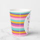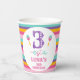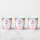 Morado Número Tres-esta Tercer Cumpleaños Cups Chicas de la fiesta de la copa de papel de tercer cumpleaños con un colorido patrón a rayas, gran número morado, algunas maracas y un texto multicolor.