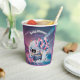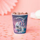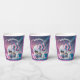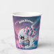 Una taza de papel para una ducha de bebé de temática espacial decorada con globos azules y rosas, adecuada para todos los géneros