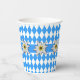 Las tazas de papel Oktoberfest se realizan siguiendo el patrón tradicional de marcado de diamantes azul y blanco de Oktoberfest, con gráficos de flores alpinas blancas llamadas Edelweiss, que recorren el medio.