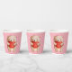 Cupas de papel con un lindo ilustracion acuarela. Un oso de peluche marrón cargando un gran corazón rojo. La polka amarilla clara tiene un fondo rosado.