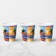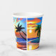 tazas de papel de fiesta de cumpleaños. Silueta de palmeras de colores antiguos y olas oceánicas en una playa de arena artificial generaron obras de arte.