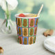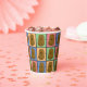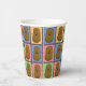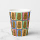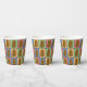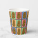 Divertidos y coloridos fiestas de papel tazas estilo almohadilla de ratón con un patrón de rectángulos de diferentes colores cada uno con una feliz papa marrón en el medio.