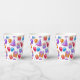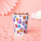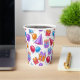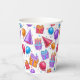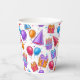 Un patrón colorido de vasos de papel para celebración de cumpleaños con sombreros de fiesta, globos y pastelitos