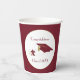 Elegantes tazas de papel de la fiesta de graduación, hechas en marrón, con un área de texto redondo blanco. Gráficos de un gorro de mortero y diploma, decoran el círculo, con texto marrón personalizado listo para personalizar. Se ofrecen toallas y platos de papel coincidentes para la fiesta de graduación.