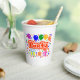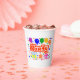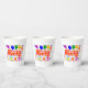 White 8 oz Paper Cup=optional, No Lid=optional with a Drawing/Design of the Word = Party, in the color Red and White, with some Colorful Balloons, Confetti, and Gift Packages, = (Drawing/Design by P. J.M.) = on the front and back of it