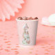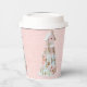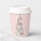 Este diseño de taza de papel presenta un moderno castillo de galletas de jengibre pastel hecho con 4 capas de galletas. Los colores son rosa claro, azul claro y verde claro y el bronceado en un fondo rosa con un patrón de copos de nieve blanco.
