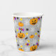 Un lindo y divertido patrón de Halloween con calabazas, dulces, arañas y telarañas sobre un fondo gris claro. ¡Perfecto para tu fiesta de Halloween!