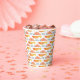 Este diseño de arte folclórico presenta un patrón de peces naranja, amarillo y verde azulado.