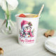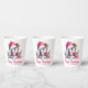 Estas tazas de papel de Navidades rojas y blancas con un pingüino lindo, un muñeco de nieve pequeño, y vegetación festiva presentan un dicho de Feliz Navidad y una plantilla para que tu nombre de familia las personalize para el fiesta de Navidad.