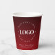 Estas tazas de papel, con fondo rojo oscuro, logotipo personalizado y texto serían excelentes para uso regular o promocional. Añade fácilmente tu logotipo y otra información haciendo clic en la opción "personalizar".