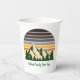 Personalizar tus tazas de papel fiesta de viaje familiar para conmemorar un viaje por la naturaleza este verano o otoño. Personalice con su apellido bajo el bosque verde de árboles y la puesta de sol de las montañas oscuras para unas vacaciones frescas para su grupo exterior.