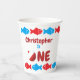 Pesca de regalos de primer cumpleaños con peces rojos y azules y bobber del pescador
