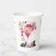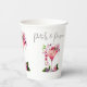 Elegantes Flores de Jardín con Copa de Champán, Frutas y texto "Pétalos y Prosecco" Tazas de papel con tema floral para despedida de soltera en colores lila, lavanda, rosa, melocotón, albaricoque y verde.