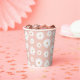 Añade un toque final a la fiesta de cumpleaños de tu pequeña con estas tazas de papel, con un patrón de margaritas en un fondo rosado.