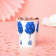Globos azules, tazas de papel para el cumpleaños de un niño. Incluya su edad, que se envuelve alrededor de la taza. Cada número parece estar sosteniendo un montón de globos azules brillantes.