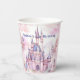 Hermosa imagen acuarela de un castillo de cumpleaños de princesa rosa y púrpura en tazas de papel.