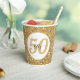 Purpurinas blancos y dorados felices tazas de papel de cumpleaños para un niño de 50 años. Un diseño brillante para las mujeres. Personalizar la edad para su ocasión. Gran decoración de fiesta de cumpleaños para un bash de 50 años.