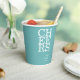 This modern wedding set has a warm, personal feel and many pieces feature an abstract, watercolor design resembling reflections on water. This coordinating paper cup has a solid color background of deep teal blue, striking typography of 'Cheers' along with your names and wedding date. Search ID774 to see the complete set of matching products and additional color options for this design.