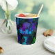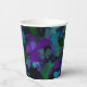 El arte púrpura, azul, verde y negro comenzó como una foto de las coloridas plumas de un pavo real y se transformó en estas coloridas tazas de papel Hola!. Por celeste@khoncepts.com