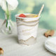 Este conjunto de diseño boda, con su patrón abstracto de ondas fluyentes y venas de oro brillante, trae a la mente llamativas formaciones rocosas y gemas brillantes. La paleta de colores neutros, en tonos champán y piedra de jabón, aporta un toque de encanto. El vaso de papel de coordinación que se muestra aquí tiene un fondo abstracto que contiene el texto opcional de 'Saludos a la pareja feliz' junto con sus nombres y fecha de boda. Busque ID903 para ver otras opciones de color y piezas de coordinación para esta colección de bodas única.