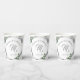 El diseño de Lace blanco y hojas de Rosa presenta nombres de pareja en un elegante texto plateado mostrado como arco contra un respaldo blanco. El fondo muestra la imagen de encaje blanco. El centro muestra el apellido inicial de la pareja. A continuación se muestra la fecha de boda. Las hojas rosas verdes se colocan delicadamente en los bordes.