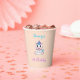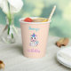 Un unicornio blanco y suave con cuerno azul y púrpura sobre fondo rosado. Sólo hay que añadir un nombre a este diseño.