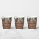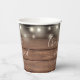 Elegante taza rústica de papel boda personalizada con nombres de estilo y su fecha especial boda en un fondo de luces de cuerda y paneles de madera. Diseñado por Thisisnotme©