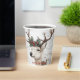 Esta taza de papel presenta un ilustracion rústico de reno con una corona de pino y baya roja sobre sus cuernos. El fondo tiene un aspecto vintage, texturizado con escritura manuscrita, y "Feliz Navidad" se muestra en negrita y rojo. Perfecto para añadir un toque vacacional acogedor a la temporada de Navidades.