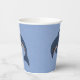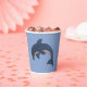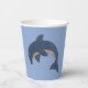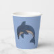 Estas tazas de papel tienen un brillo como un delfín que es azul oscuro con un vientre blanco en una posición saltante en el frente y la espalda sobre un fondo azul claro.