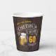 Elegantes vítores y cervezas a 60 años diseño tipográfico sobre fondo de grano de madera marrón, personalizado con tu propio texto, divertido y único, ideal para cualquier fiesta de cumpleaños adulto para hombres, o fiesta de aniversario para cualquier ocasión.
