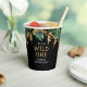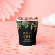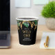 Celebre el primer cumpleaños de su pequeña persona salvaje con estas tazas de papel con temática safari, con monos de Relieve metalizado de imitación dorada y follaje de jungla verde y dorada. Agregue el nombre de su hijo y otro texto personalizado en oro y blanco sobre un fondo negro.