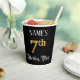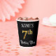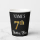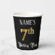 Este elegante y opulento diseño de tazas de papel de cumpleaños incluye un nombre editable y el mensaje "Séptima fiesta de cumpleaños". El gran número "7th" tiene un patrón de color falso/imitación de inspiración dorada, las palabras "Birthday Party" están en un texto ornamentado de escritura, y el fondo es negro de color por defecto (aunque se puede personalizar). Unas tazas de papel elegantes y ornamentadas como esta podrían ser útiles para tener en una celebración de cumpleaños para celebrar el séptimo cumpleaños de alguien. [~Z0000567]