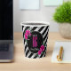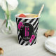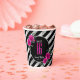 Celebrate in style with this unique Sweet Sixteen paper cup design featuring a large, faux foil 'Sweet 16' in silver and hot pink. The solid black background is topped with diagonal stripes in the same silver foil effect with lush hot pink roses around an oval frame. If preferred, the eye-catching 'Sweet 16' is optional and can be deleted to use this template for other occasions. Use the provided template to customize your name and birthdate. Search ID759 to see other products and color options for this design.